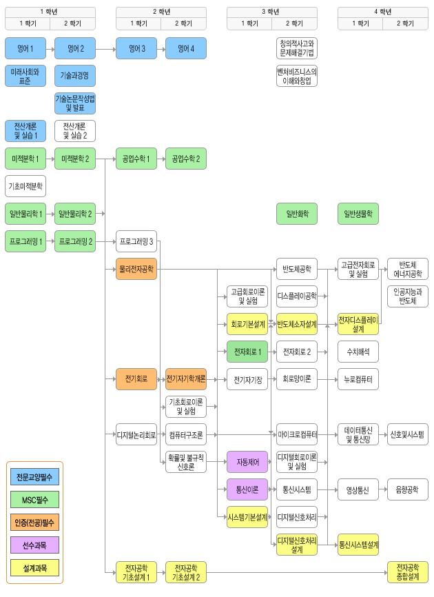 | 전공 | 54 | [인증필수과목]? 물리전자공학, 전기회로, 전기자기학개론, 자동제어, 통신이론 [전문설계과목] 전자공학기초설계1, 전자공학기초설계2, 회로기본설계, 시스템기본설계, 반도체소자설계, 디지털신호처리설계, 통신시스템설계, 전자공학종합설계 [부분설계과목] (설계1학점) 고급전자회로및실험,수치해석,뉴로컴퓨터,영상통신,데이터통신및통신망 (설계과목은 전자공학기초설계1,전자공학종합설계를 포함하여 12학점 이상 수강) |