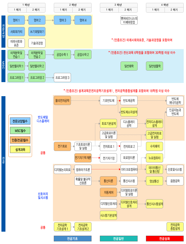 | 전공 | 54 | [인증필수과목] 물리전자공학, 전기회로, 전기자기학개론, 자동제어, 통신이론 [전문설계과목] 전자공학기초설계1, 전자공학기초설계2, 회로기본설계, 시스템기본설계, 반도체소자설계, 디지털신호처리설계, 통신시스템설계, 전자공학종합설계 [부분설계과목] (설계1학점) 고급전자회로및실험,수치해석,뉴로컴퓨터,영상통신,데이터통신및통신망 (설계과목은 전자공학기초설계1, 전자공학종합설계를 포함하여 12학점 이상 수강.) |