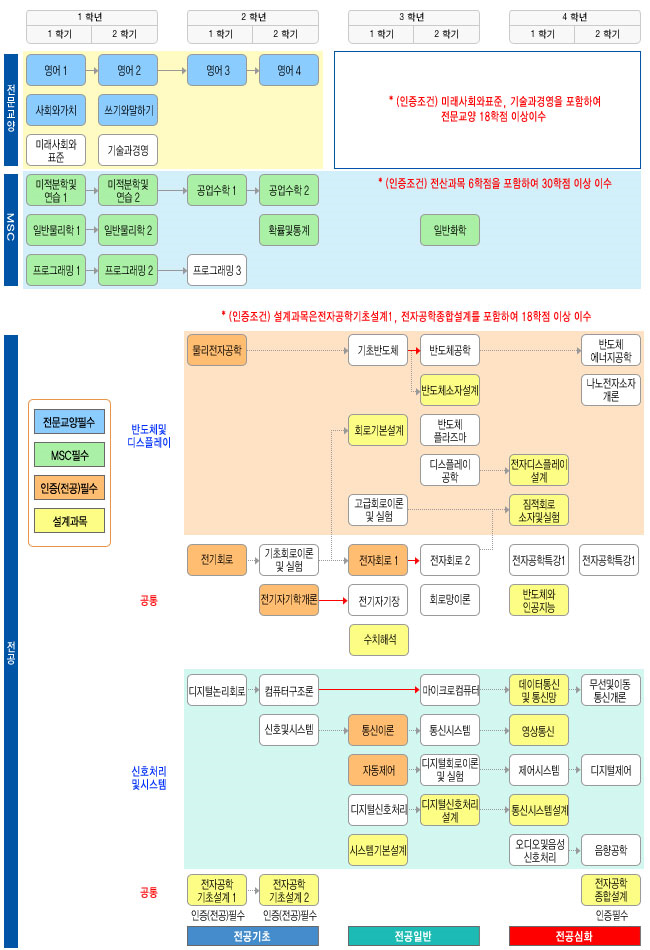 | 전공 | 54 | [인증필수과목] 물리전자공학, 전기회로, 전기자기학개론, 자동제어, 통신이론, 전자회로1 [전문설계과목] 전자공학기초설계1, 전자공학기초설계2, 회로기본설계, 시스템기본설계, 반도체소자설계, 디지털신호처리설계, 통신시스템설계, 전자공학종합설계 [부분설계과목] (설계1학점) 영상통신, 디지털회로이론및실험, 데이터통신및통신망 (설계과목은 전자공학기초설계1, 전자공학종합설계를 포함하여 12학점 이상 수강.) |