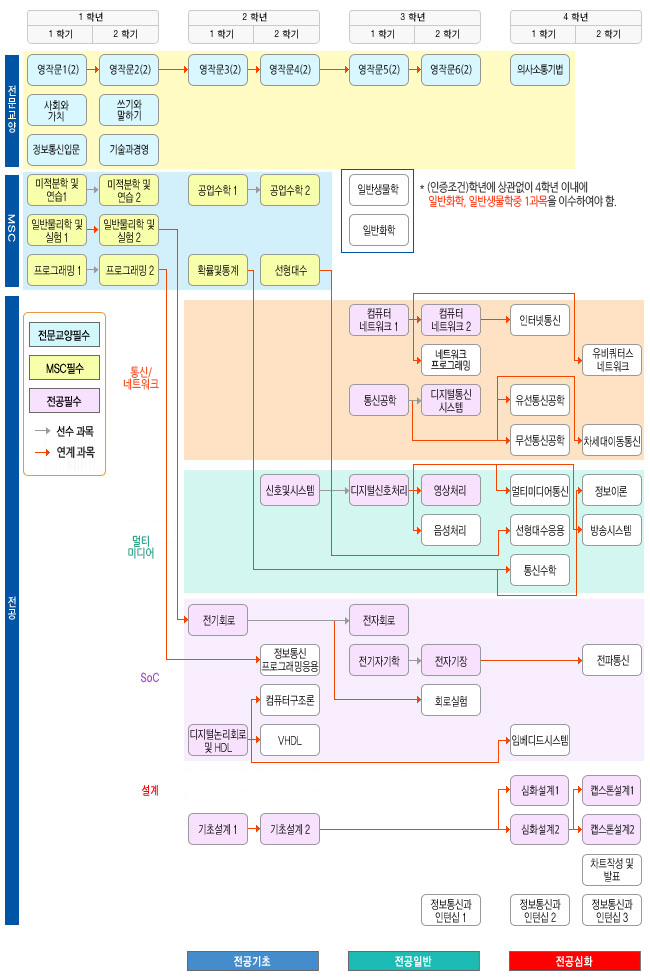 | 전문교양 | 18 | 영어1ㆍ2ㆍ3ㆍ4, 사회와가치, 쓰기와말하기 - 인증필수 영어5ㆍ6ㆍ7ㆍ8 - 인증선택 (교양필수) 정보사회의 사이버윤리(전자공학개론 대체과목), 전자공학개론, 기술과경영을 포함하여 전문교양 18학점 이상 이수. |
