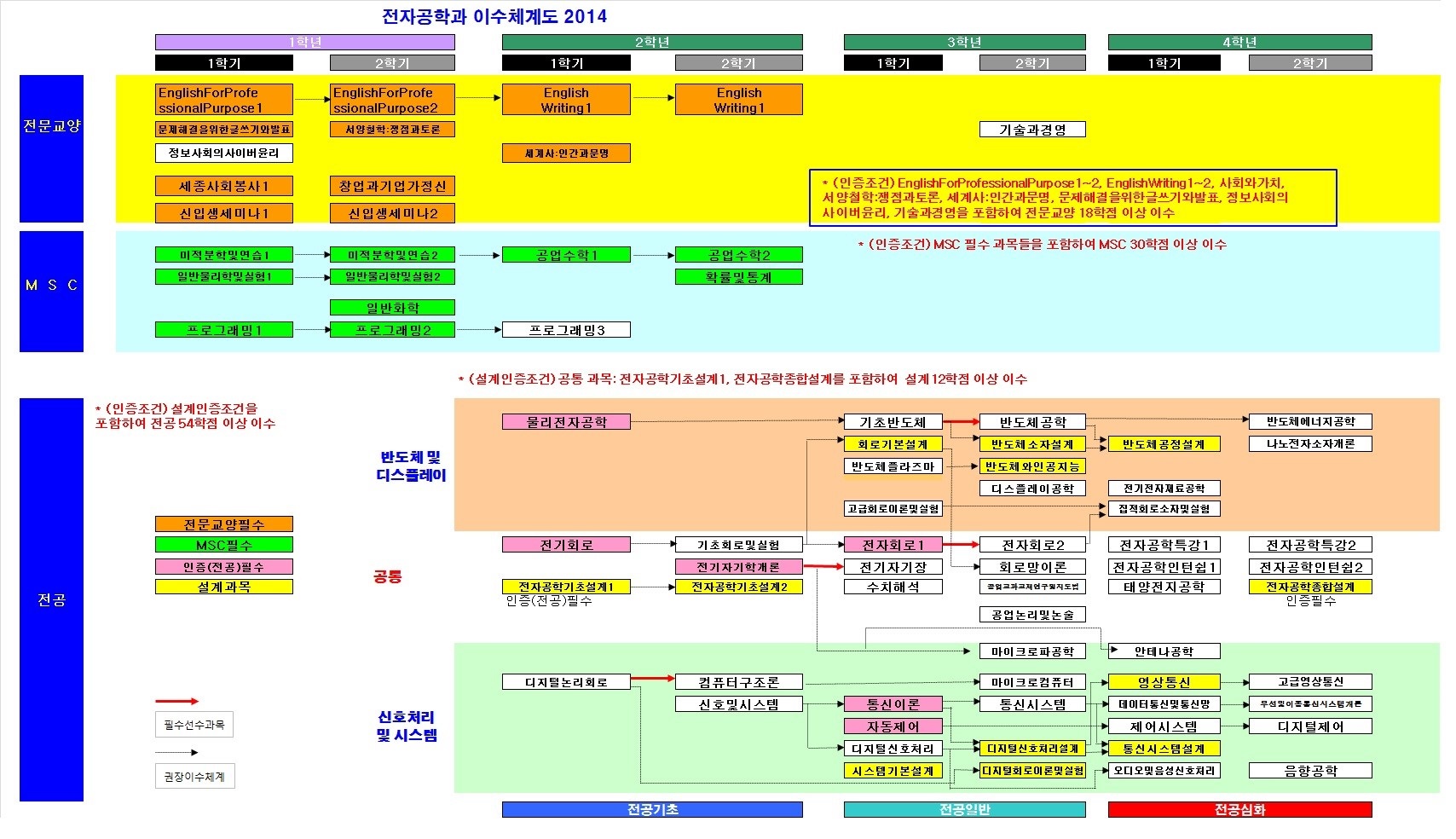 | 전공 | 54 | [인증필수과목] 물리전자공학, 전기회로, 전기자기학개론, 자동제어, 통신이론, 전자회로1 [전문설계과목] (설계 3학점) 전자공학기초설계1, 전자공학종합설계 [부분설계과목] (설계2학점) 전자공학기초설계2, 회로기본설계, 시스템기본설계, 반도체소자설계, 디지털신호처리설계, 통신시스템설계, 반도체공정설계 (설계과목은 전자공학기초설계1, 전자공학종합설계를 포함하여 9학점 이상 수강. |