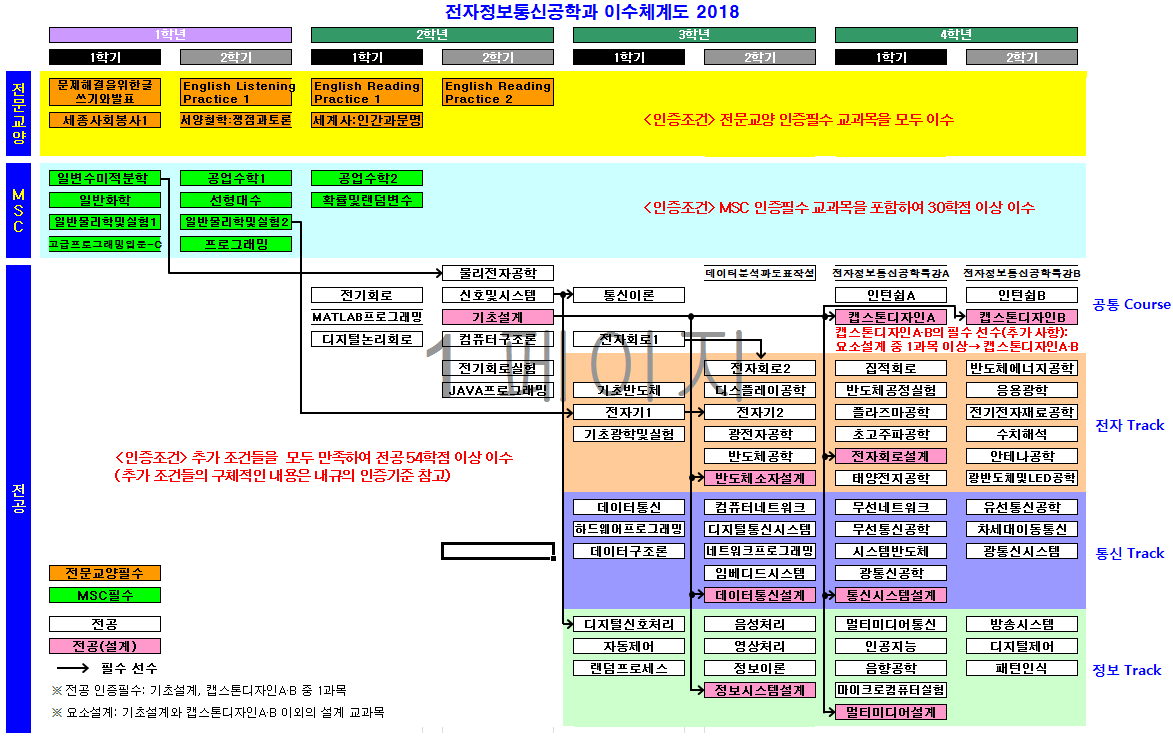 | 전공 | 54 | - 인증조건: 아래 추가 조건을 모두 만족하여 전공 54학점 이상 이수 (a) 설계 교과목 이수조건: 기초설계 이수 및 캡스톤디자인AㆍB 중 하나 이수를 포함하여 설계 9학점 이상 이수 [설계 교과목] ◇ 기초설계(설계 3학점): 기초설계 ◇ 요소설계(설계 2학점): 반도체소자설계, 데이터통신설계, 정보시스템설계, 전자회로설계, 통신시스템설계, 멀티미디어설계 ◇ 종합설계(설계 3학점): 캡스톤디자인A, 캡스톤디자인B (b) 실험ㆍ실습 교과목 이수조건: 실험ㆍ실습 교과목을 1과목 이상 이수. 단, 실험ㆍ실습 교과목 해당 여부는 ‘2018년도 교과과정표’ 참고 (c) 일반영역 교과과정 이수조건: 일반영역 교과과정의 교과목을 24학점 이상 이수 [일반영역 교과과정의 교과목] 전기회로, 신호및시스템, 기초설계, 물리전자공학, 전자회로1, 통신이론, 전자기1, 기초반도체, 데이터통신, 디지털신호처리, 광전자공학, 컴퓨터네트워크, 디지털통신시스템, 음성처리, 영상처리 (d) 이수체계 준수조건: 선후수 지정 교과목의 이수체계 준수 (후수 교과목을 이수하기 위해서는 미리 선수 교과목을 이수해야 함) [선후수 교과목] ◇ 설계 교과목: 기초설계→캡스톤디자인AㆍB. 기초설계→요소설계 전교과목. 요소설계 중 1과목 이상→캡스톤디자인AㆍB. 단, 기초설계 이수 전 및 캡스톤디자인AㆍB 이수 후에 이수하는 설계 교과목은 설계 학점 미인정하며, 캡스톤디자인A와 캡스톤디자인B를 모두 이수할 경우 설계 3학점만 인정. ◇ MSC와 전공 교과목: 일변수미적분학→물리전자공학, 일반물리학및실험2→전자기1 ◇ 전공 교과목: 전자회로1→전자회로2, 전자기1→전자기2, 신호및시스템→디지털신호처리, 신호및시스템→통신이론 |