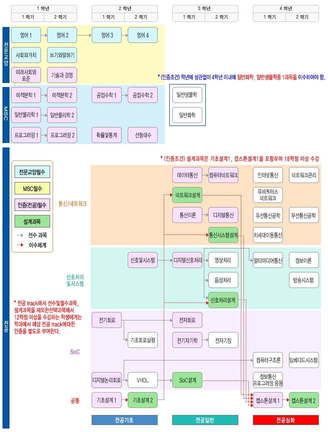 | 전공 | 54 | - 전공(인증)필수 : 15학점 - 전공(인증)선택 : 39학점 이상 * 전공선택 수강 과목에는 선택 설계과목인 “네트워크설계”, “통신시스템설계”, “신호처리설계”, “SoC설계”, 4과목 중에서 2과목 이상이 반드시 포함되어야 함. * 설계과목은 지정설계과목인 “기초설계1”, “캡스톤설계1”을 포함하여 12학점이상 이수 * 선수과목으로 지정된 과목, 즉 “인선(선수)”과목은 특정 상위 과목에 대한 선수과목으로서, 특정 상위과목을 수강하기 위해서는 반드시 “인선(선수)” 과목을 이수해야 함. ● 좌측의 교과목을 수강하기 위해서는 우측의 “선수 과목”을 이수해야 수강신청이 가능 함.