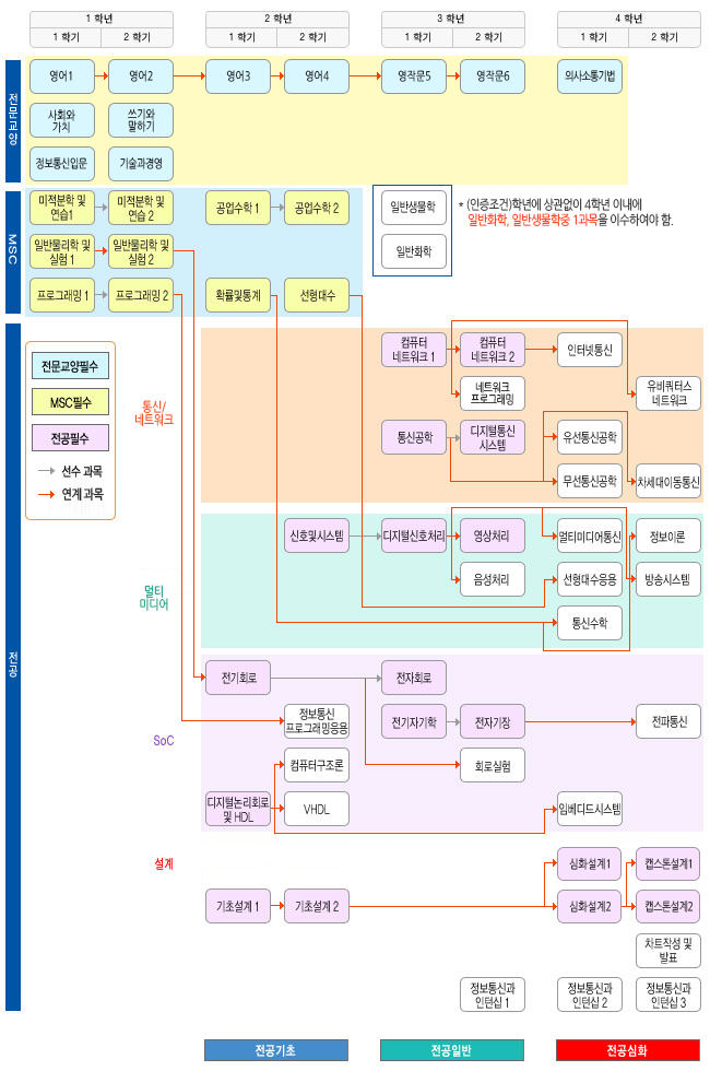 | MSC | 30 | 미적분학및연습1, 미적분학및연습2, 일반물리학및실험1, 일반물리학및실험2, 프로그래밍1, 프로그래밍2, 공업수학1, 공업수학2, 일반화학, 확률및통계 (전산과목 6학점을 포함하여 30학점 이상 이수해야 함.) |