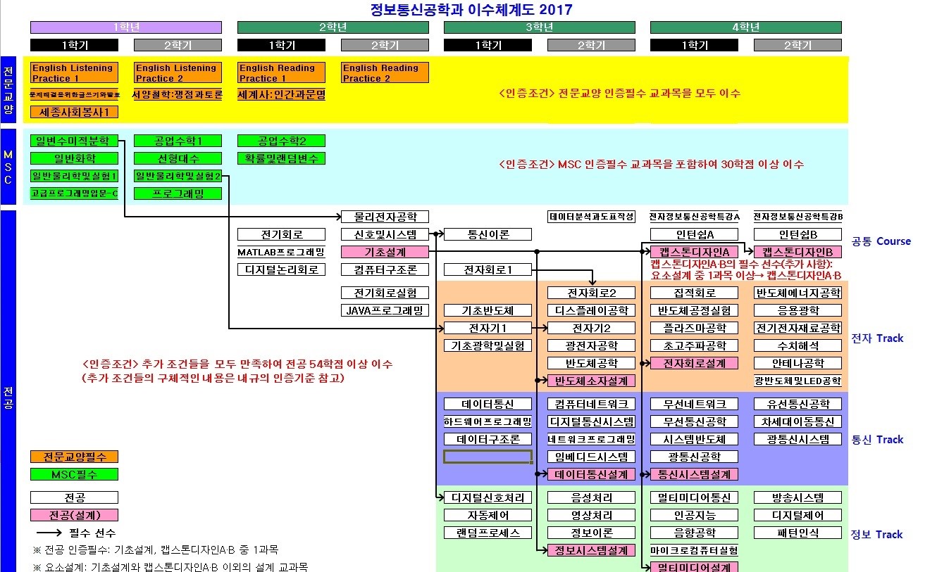| 전공 | 54 | - 인증조건: 아래 추가 조건을 모두 만족하여 전공 54학점 이상 이수 (a) 설계 교과목 이수조건: 기초설계 이수 및 캡스톤디자인AㆍB 중 하나 이수를 포함하여 설계 9학점 이상 이수 [설계 교과목] ◇ 기초설계(설계 3학점): 기초설계 ◇ 요소설계(설계 2학점): 반도체소자설계, 데이터통신설계, 정보시스템설계, 전자회로설계, 통신시스템설계, 멀티미디어설계 ◇ 종합설계(설계 3학점): 캡스톤디자인A, 캡스톤디자인B (b) 실험ㆍ실습 교과목 이수조건: 실험ㆍ실습 교과목을 1과목 이상 이수. 단, 실험ㆍ실습 교과목 해당 여부는 ‘2017년도 교과과정표’ 참고 (c) 일반영역 교과과정 이수조건: 일반영역 교과과정의 교과목을 24학점 이상 이수 [일반영역 교과과정의 교과목] 전기회로, 신호및시스템, 기초설계, 물리전자공학, 전자회로1, 통신이론, 전자기1, 기초반도체, 데이터통신, 디지털신호처리, 광전자공학, 컴퓨터네트워크, 디지털통신시스템, 음성처리, 영상처리 (d) 이수체계 준수조건: 선후수 지정 교과목의 이수체계 준수 (후수 교과목을 이수하기 위해서는 미리 선수 교과목을 이수해야 함) [선후수 교과목] ◇ 설계 교과목: 기초설계→캡스톤디자인AㆍB. 기초설계→요소설계 전교과목. 요소설계 중 1과목 이상→캡스톤디자인AㆍB. 단, 기초설계 이수 전 및 캡스톤디자인AㆍB 이수 후에 이수하는 설계 교과목은 설계 학점 미인정하며, 캡스톤디자인A와 캡스톤디자인B를 모두 이수할 경우 설계 3학점만 인정. ◇ MSC와 전공 교과목: 일변수미적분학→물리전자공학, 일반물리학및실험2→전자기1 ◇ 전공 교과목: 전자회로1→전자회로2, 전자기1→전자기2, 신호및시스템→디지털신호처리, 신호및시스템→통신이론 |