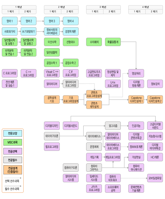 | 전공 | 60 | * 지정설계과목 : 공학설계기초(2-1), 기초프로그래밍설계(2-2), 콘텐츠프로그래밍설계(3-1) 또는 콘텐츠저작설계(3-1), Capstone디자인설계1(4-1), Capstone디자인설계2(4-2) (위 지정설계 과목은 필수임) * 선택설계 과목 (교과목당 이론2학점, 설계1학점으로 구성됨, 과목명(학년-학기)) : 디지털디자인(2-1), 멀티미디어프로그래밍(2-2), 디지털사운드(2-2), 영상편집및제작(3-2), HCI개론(4-2), 지능형시스템 (4-2) (위 선택설계 과목 중 3과목을 선택) (지정설계 과목 15학점과 선택설계 3과목의 설계 3학점을 포함하여 전공교과목은 60학점이상 이수) |