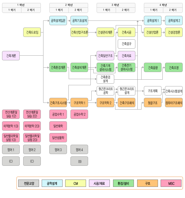 | MSC | 31 | 수학 및 기초과학, 전산학(MSC) : 31학점 이상 a) 교양(인증)필수 : 28학점 b) 교양(인증)선택 : 3학점 이상 * 3개의 지정 MSC 교과목 중 1과목 이상 이수 |