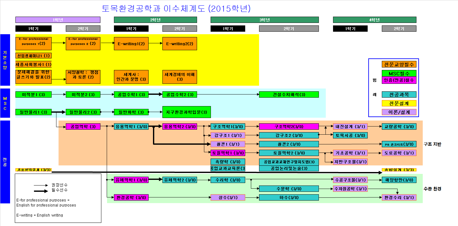 | MSC | 30 | 미적분학 및 연습1,2, 일반물리학 및 실험1,2,고급프로그래밍입문, 공업수학1,2, 일반화학, 지구환경과학입문, 건설수치해석 (위 수학, 기초과학, 전산학 과목을 포함하여 30학점이상 이수) |