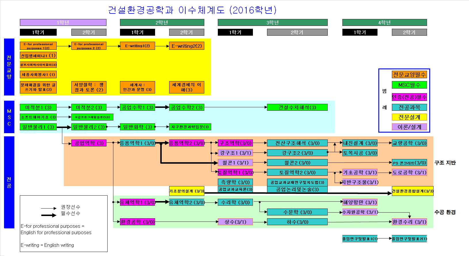 | MSC | 30 | 미적분학 및 연습1,2, 일반물리학 및 실험1,2,고급프로그래밍입문, 공업수학1,2, 일반화학, 지구환경과학입문, 건설수치해석 (위 수학, 기초과학, 전산학 과목을 포함하여 30학점이상 이수) |