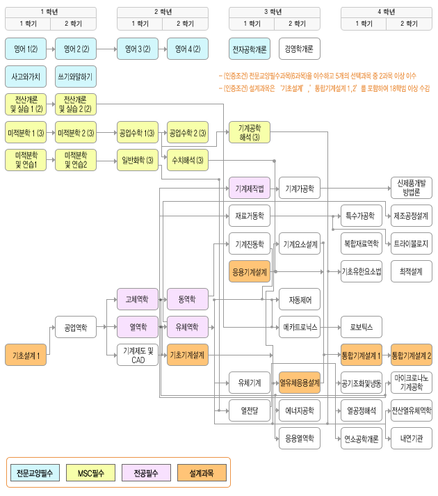 | 전공 | 60 | * 전공 이론 및 설계 60학점 이상 : 설계 학점 18학점 이상 구성,설계 교과목은 18학점 이상 * 설계과목 : 설계 관련 open problem을 제시하여 각 학생이 답을 찾아가는 과정과 결과 제시로 평가하는 과목으로, 공학설계요소 (목표와 기준 설정, 합성, 분석, 제작, 시험, 평가)를 고루 교육시킬 수 있도록 구성 * 1학년 기초설계 1과목, 2,3학년 요소설계 3과목, 4학년에는 "종합설계(Capstone Design) 과목 2과목을 개설한다. |