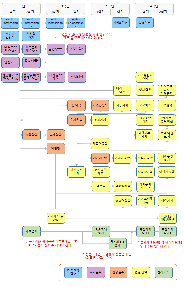 | 전공 | 60 | * 전공 이론 및 설계(설계교과목 12학점이상) 60학점 이상 :설계 학점 15학점 이상 구성 * 설계과목 : 설계 관련 open problem을 제시하여 각 학생이 답을 찾아가는 과정과 결과제시로 평가하는 과목으로, 공학설계요소 (목표와 기준 설정, 합성, 분석, 제작, 시험, 평가)를 고루 교육시킬 수 있도록 구성* 1학년 – 기초설계 2,3학년 - 응용기계설계, 열유체응용설계 4학년- 통합기계설계1, 통합기계설계2 로 설계과목 구성 |