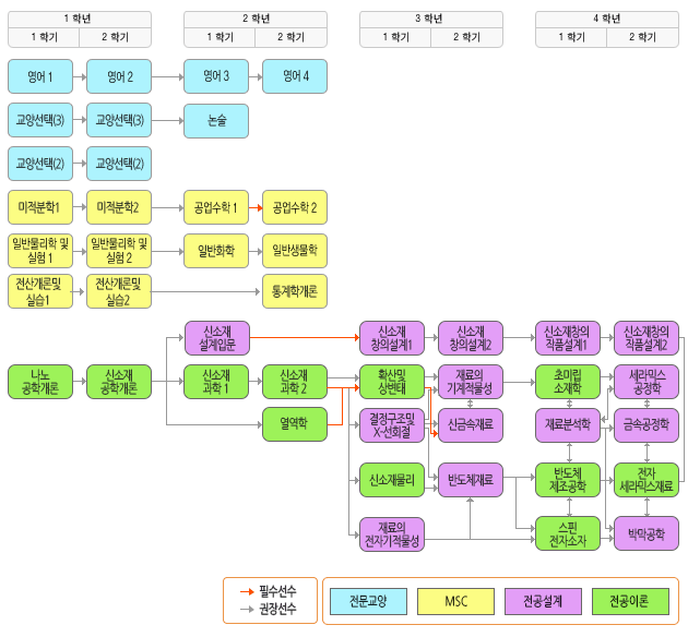 | 전공 | 60 | 설계 교과목은 18학점이상 (괄호 안은 각 과목 해당 설계학점임) - 지정설계과목 : 신소재설계입문(3), 신소재창의설계1(3), 신소재창의설계2(3), 신소재창의작품설계1(3), 신소재창의작품설계2(3) - 전공 설계 교과목 (괄호 안은 각 과목 해당 설계학점임) : 3학년 : 결정구조및X-선회절(1), 재료의전자기적물성(1), 재료의기계적물성(1), 신금속재료(1), 반도체재료(1) 4학년 : 재료분석학(1), 세라믹스공정학(1), 금속공정학(1), 박막공학(1) |