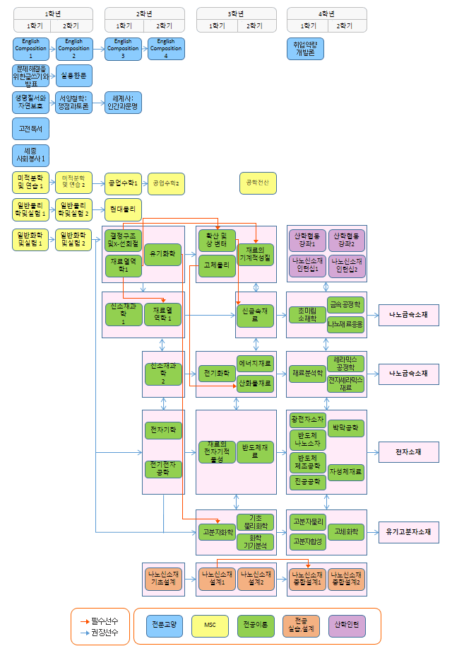 | 전공 | 54 | a) 전공 인증필수 : 24학점b) 전공 인증선택 : 30학점 이상* 설계는 나노신소재기초설계 3학점과 나노신소재종합설계 (1과 2중 택일) 3학점을 포함하여 설계내용의 학점을 9학점 이상 획득하여야 함. |
