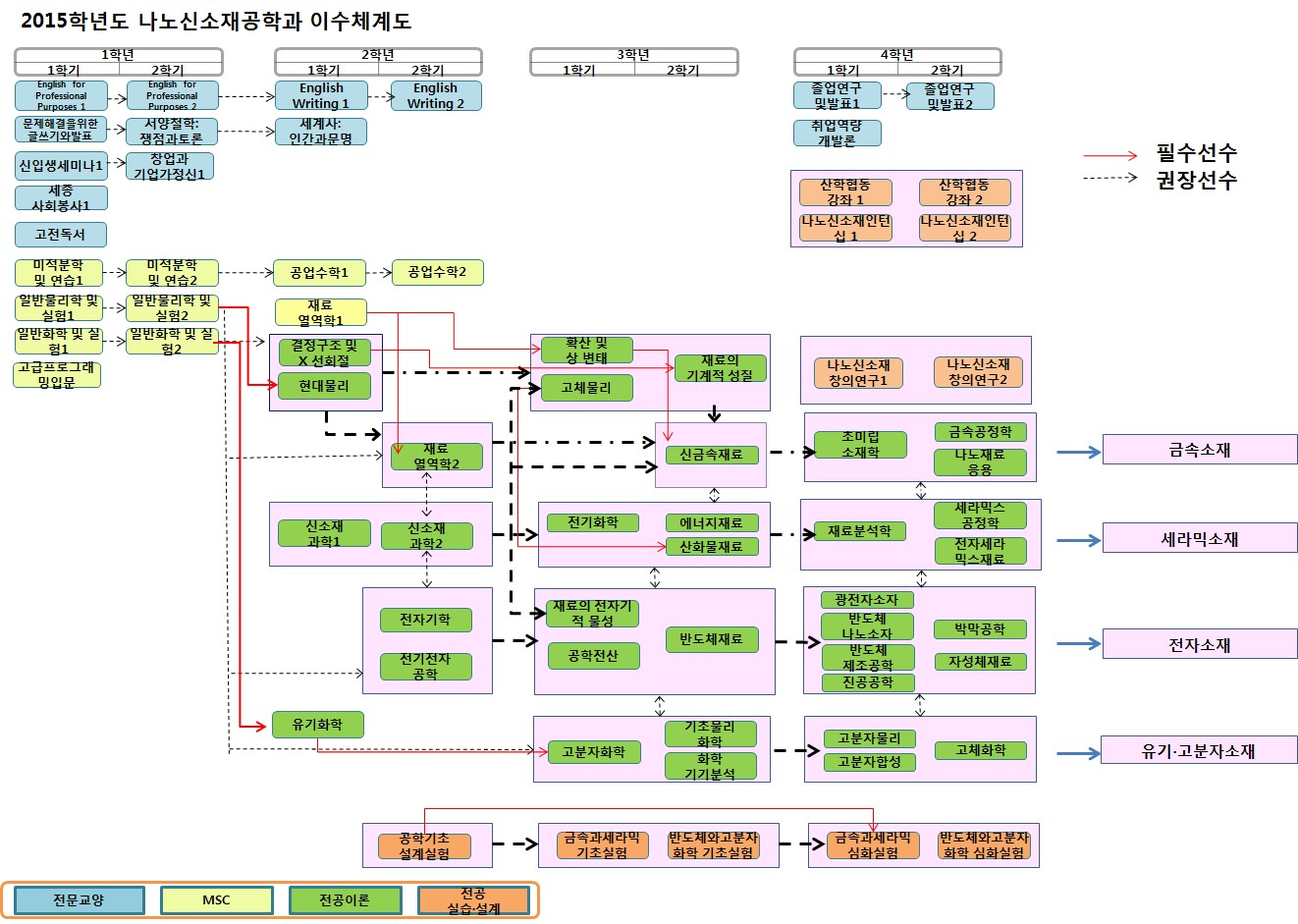 | MSC | 30 | 미적분학및연습 1, 2일반물리학및실험 1, 2공업수학 1, 2일반화학및실험 1, 2재료열역학 1, 고급프로그래밍입문 |