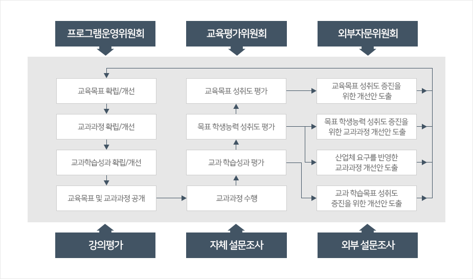 | 교육평가 위원회 | 학습성과 달성 평가 학생능력 평가체제 구축 재학생 설문조사 졸업예정자 설문조사 졸업생 설문조사 교과과정 개편 및 운영 강의의견조사 포트폴리오평가 |