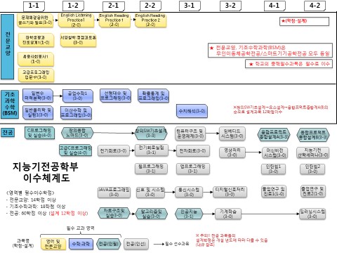 | 전공 | 60 | - 인증조건: 아래 추가 조건을 모두 만족하여 전공 60학점 이상 이수 (a) 설계 교과목 이수조건: 기초설계 이수 및 융합프로덕트종합설계를 포함하여 12학점 이수. 캡스톤설계AㆍB 중 하나 이수를 포함하여 설계 9학점 이상 이수 [설계 교과목] ◇ 기초설계(설계 3학점): 창의융합노마드, 창의SW기초설계 ◇ 종합설계(설계 6학점): 융합프로덕트종합설계A, B [일반영역 교과과정의 교과목] 동역학, 동적시스템모델링, 자동제어, 로보틱스, 유체공기역학, MEMS, 기계요소설계, 디지털시스템, 컴퓨터네트워크, 신호 및 시스템, 통신시스템, 디지털신호처리, 전기회로, 전자회로, 패턴인식, 기계학습, 딥러닝시스템, 영상처리, 머신비전시스템, 컴퓨터구조 및 운영체제, 임베디드시스템, 데이터베이스, 인턴쉽1, 인턴쉽2, 지능기전산학세미나, 졸업연구및 진로1,2, 무인비행체제어, 스마트카전장제어, 센서 및 매핑 알고리즘, 반도체소자, 반도체공정, 센서소자 및 시스템. (d) 이수체계 준수조건: 선후수 지정 교과목의 이수체계 준수 (후수 교과목을 이수하기 위해서는 미리 선수 교과목을 이수해야 함) [선후수 교과목] ◇ 설계 교과목: 창의융합노마드→창의SW기초설계→융합프로덕트종합설계A,B(중 택1) ◇ BSM와 전공 교과목: 일변수미적분학→공업수학1 ◇ 전공 교과목: 신호및시스템→통신시스템→디지털신호처리, 전기회로→전기회로실험→전자회로, 자료구조및실습→알고리즘및실습, 인공지능→패턴인식→기계학습→딥러닝시스템, 영상처리→머신비전시스템, 동역학→동적시스템모델링→자동제어→로보틱스, 반도체소자→반도체공정→센서소자 및 시스템. 컴퓨터구조 및 운영체제→임베디드시스템 |